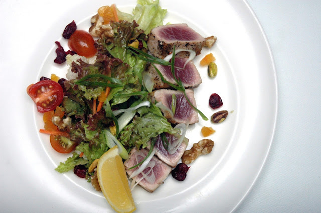 The briny sweetness of the tuna, lightly seared on the outside with a pink center, pairs well with the light yet tart and citrusy vinaigrette, the cherry tomatoes, nuts, and dried fruits adding even more flavors to the refreshing mix. And it's a great start to a romantic and indulgent dinner at Nostalgia Dining Lounge...